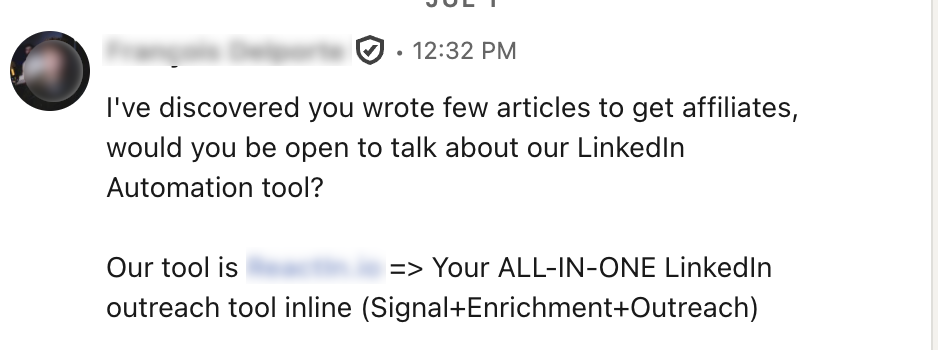 It jumps straight into pitching a tool and dropping a link, without any effort to connect. It lacks context or relevance, so the recipient has little reason to engage.