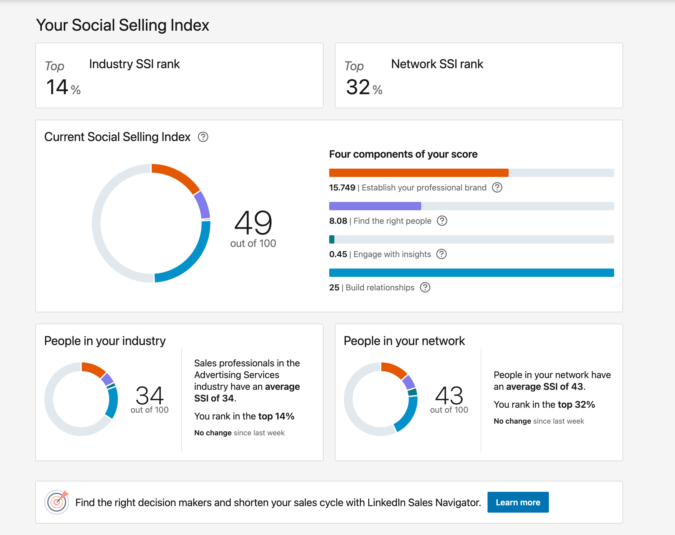 Think of your SSI score as LinkedIn’s way of measuring how effectively you’re using the platform for sales. To boost this score, make sure your profile is 100% complete with a professional photo, detailed experience, and relevant skills.