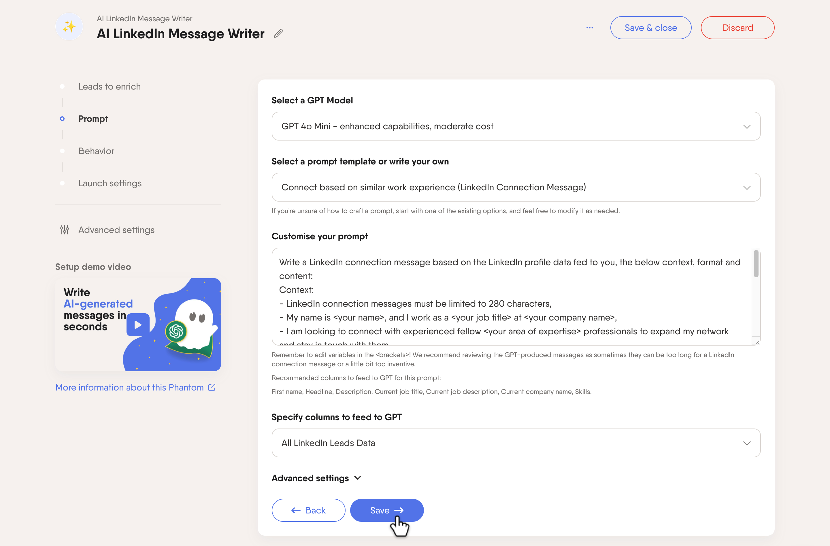 Step 2: Enrich automatically with emails, phone numbers, and job changes. After capture, PhantomBuster’s AI-powered enrichment adds contact details and buying signals so records are outreach-ready. This means fewer bounced emails and more accurate lead lists.