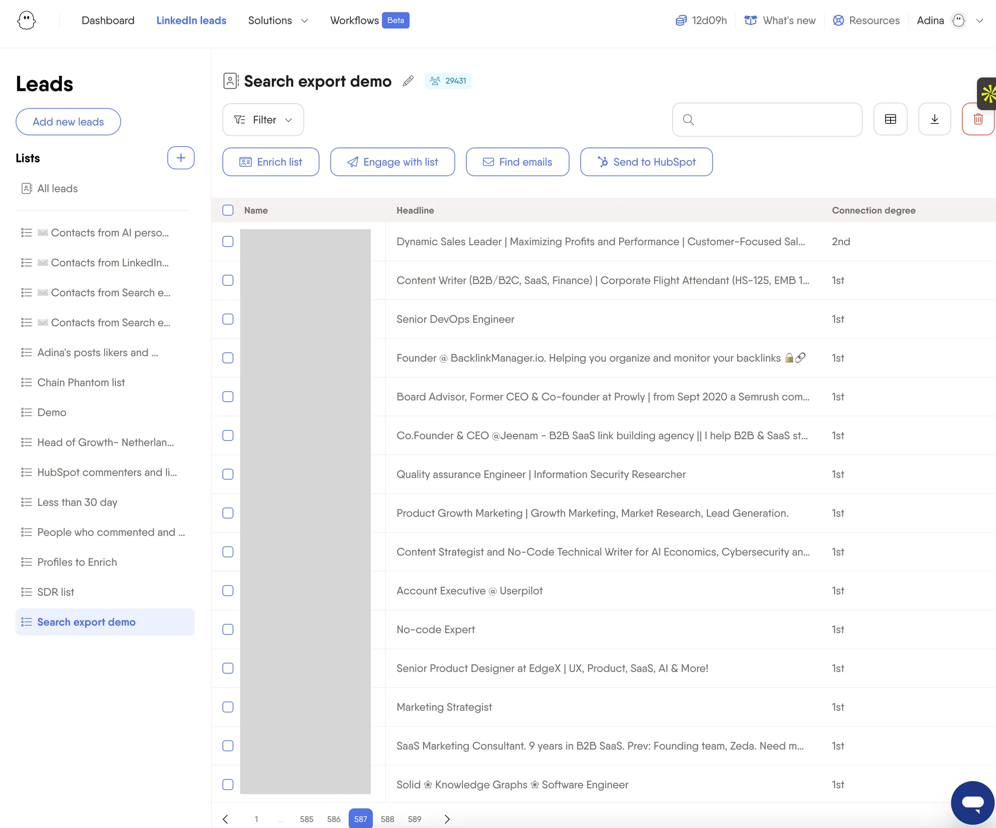 - Stage 4: Workflow CRM integration: Sync enriched leads to your CRM or email platform using built-in integrations. Apply tags, trigger sequences, and assign owners automatically. The result? Richer profiles with context, not just contact info. For example, using PhantomBuster, you can sync your contacts inside HubSpot with data available in your exported lists.