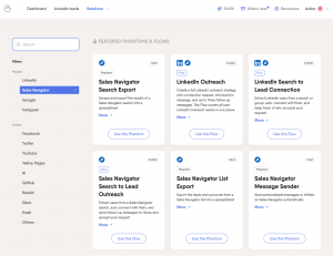 - PhantomBuster: A sales prospecting automation platform that automates LinkedIn connection requests, creates personalized connection requests, implements social warming sequences, and integrates with LinkedIn Sales Navigator for prospecting campaigns. Enables end-to-end workflows for automating LinkedIn outreach with targeting and follow-up capabilities. Keep daily limits conservative, avoid mass messaging, and personalize first touches. Always follow LinkedIn’s policies.