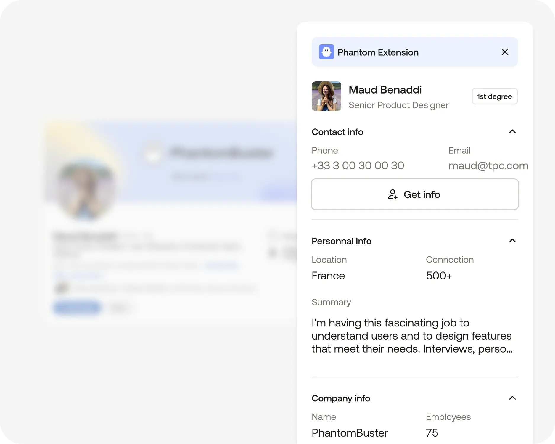 Click "Get Info" on any LinkedIn profile and instantly reveal verified emails, phone numbers, and company details.